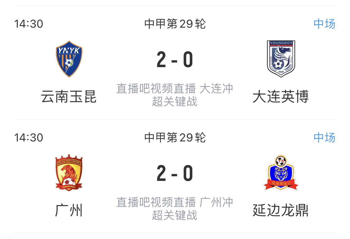 10月26日訊 中甲第29輪半場,云南玉昆2-0大連英博,廣州2-0延邊龍鼎。若按照次比分結(jié)束,中甲沖超的懸念將到最后一輪才能揭曉,大連無緣提前沖超。