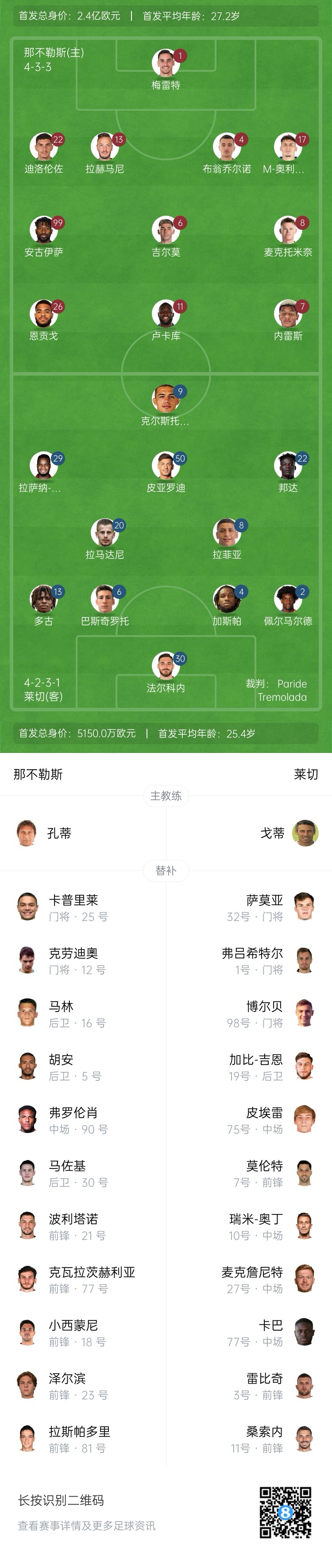10月26日訊 北京時間今晚21點,意甲第9輪,那不勒斯vs萊切,賽前雙方首發(fā)陣容出爐。
